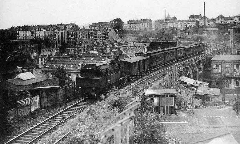 Das Foto zeigt das Wupperfelder Viadukt, aufgenommen von der Markusstraße aus, irgendwann Ende der 1950er Jahre. Der Fotograf dieses einzigartigen Dokuments ist leider unbekannt. Es handelt sich um ein bemerkenswertes Zeitzeugnis aus der unmittelbaren Nachkriegszeit im Grenzbereich von Wupperfeld und Wichlinghausen in Wuppertal.